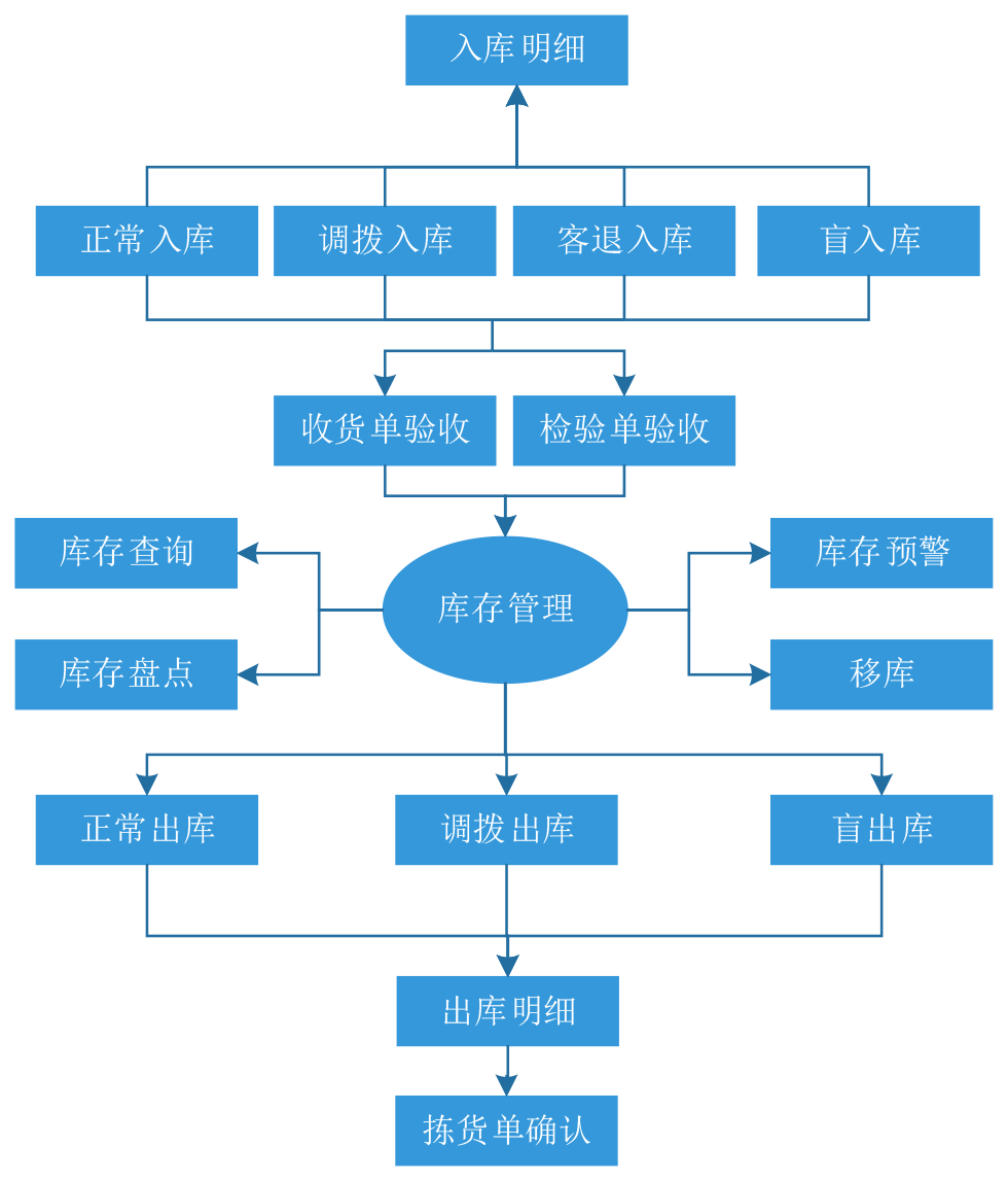 库存管理系统根据实际工作中存货业务所涉及的各项业务性质,通常都具有采购入库、产成品出库,材料出库、材料退库、销售出库,盘点管理业务等功能,同时根据各业务的不同对不同人员授权,对业务处理进行监督控制。如材料退库业务中,需要生产部门、仓库部门、财务部门签字后方可生效,可以对对退货业务做到有效地监督和控制。此外,系统还提供出库跟踪入库管理、可用量控制的全面业务,使管理人员可以及时掌握库存的动态信息,对库存的安全性进行控制,避免库存积压占用资金或材料短缺影响生产。